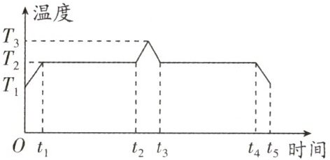 D 解析:AB.由图像可知,该材料在温度为$ T_{2} $时温度保持不变,即有固定的熔化和凝固温度,所以该相变材料是晶体,熔点和凝固点均为$ T_{2} $,故AB正确;CD.由图可知,$ t_{1} \sim t_{2} $时间内,该材料正在熔化,吸收热量,$ t_{3} \sim t_{4} $时间内,该材料正在凝固,放出热量,此时是固液共存状态,故C正确,D错误.故选D.