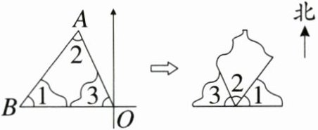 5. 如右图所示,点A在点O的( )偏( )( )°方向,把三角形的三个角撕下来,然后拼在一起,就可以看到∠1,∠2,∠3正好可以组成一个( )角,即∠1+∠2+∠3= ( )°。