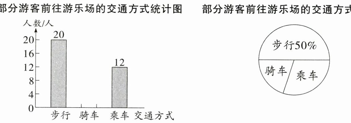 王叔叔投资兴建了一个游乐场,以下是他调查的部分游客前往游乐场的交通方式,以及各种交通方式所占百分比,绘制了如下两幅统计图。