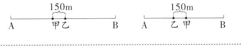 本题考查对相遇问题的理解。解题的关键在于理解两人相距150 m有两种情况(如图)。一种是没有相遇,则两人行的路程和比全程少150 m;另一种是相遇之后又行了一段距离,则两人行的路程和比全程多150 m。