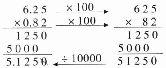 $\begin{array}{r}6.25\\ ×\ 0.82\\ \hline1250\\5000\ \\\hline5.1250\end{array} $ $\xrightarrow[×0.82]{×100}$ $\begin{array}{r}625\\ ×\ 82\\ \hline1250\\5000\ \\\hline51250\end{array} $ $\xleftarrow{÷10000}$