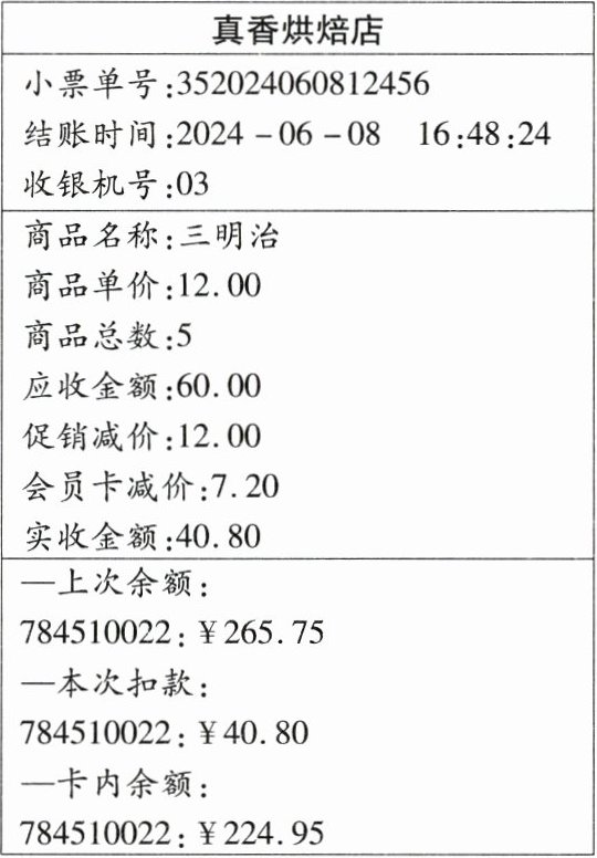 2. 烘焙店五周年庆搞促销活动,所有商品打八折。王叔叔购买了 5 个三明治,下图是他用会员卡购买三明治后获得的购物小票(会员卡使用说明:会员卡按照烘焙店促销降价后的价格再打折结算),观察图中小票上的信息,王叔叔所持会员卡是打几折结算的?(4%)