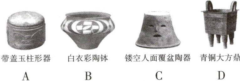 D A 项“带盖玉柱形器”的俯视图是圆形,不符合题意; B 项“白衣彩陶钵”的俯视图是圆形,不符合题意; C 项“镂空人面覆盆陶器”的俯视图是圆形,不符合题意; D 项“青铜大方鼎”的俯视图是四边形,符合题意.