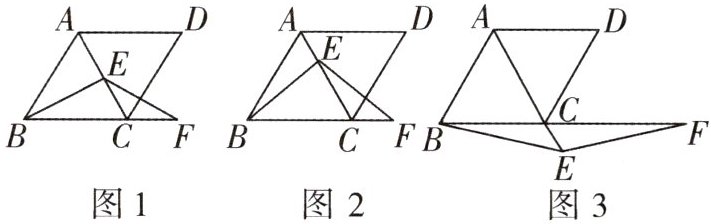 14 推理能力[2024九江十一中月考]在菱形ABCD中,$ ∠ABC = 60^{\circ} $,E是对角线AC上一点,F是线段BC的延长线上一点,且$ CF = AE $,连接BE,EF. 如图1,当点E是线段AC的中点时,易证$ BE = EF $.