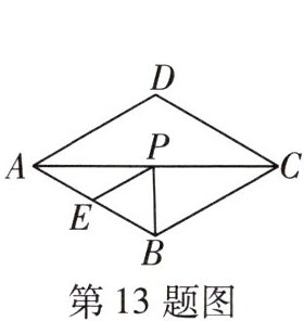 13 [2024石嘴山八中期中]如图,在菱形ABCD中,$ AB = 2 $,$ ∠ABC = 120^{\circ} $,E是AB的中点,P是对角线AC上的一个动点,则$ PE + PB $的最小值是______.