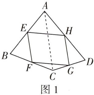 点H,G分别是AD,CD的中点$\xrightarrow{三角形中位线定理}HG// AC,$$HG= \frac{1}{2}AC→EF// HG,$EF= HG→四边形EFGH是平行四边形.