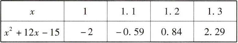 B 因为$x=1.1$时,$x^{2}+12x-15=-0.59<0$,$x=1.2$时,$x^{2}+12x-15=0.84>0$,所以方程$x^{2}+12x-15=0$必有一个根满足$1.1<x<1.2$。