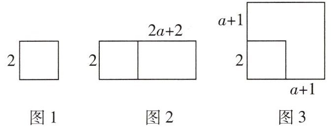 14 [2025 盐城盐都区第一共同体月考节选]如图 1,将边长为 2 的正方形一边保持不变,另一组对边增加 $2a + 2(a > 0)$,得到如图 2 所示的新长方形,此长方形的面积为 $S_{1}$;将正方形的边长增加 $a + 1(a > 0)$,得到如图 3 所示的新正方形,此正方形的面积为 $S_{2}$。