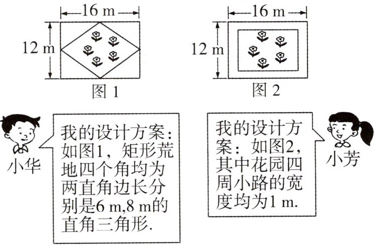 3 应用意识 教材P44随堂练习变式[2025衡水九中期中]要在一块长16m、宽12m的矩形荒地上建造一个花园,要求花园面积是荒地面积的一半,下面分别是小华与小芳的设计方案.