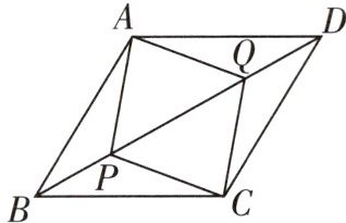 D 如图,连接 $AC$,$\because$ 四边形 $APCQ$ 是菱形,$\therefore AP = PC = CQ = AQ$,$AQ // PC$,$AC \perp BD$,$\therefore \angle AQP = \angle CPQ$,$\therefore \angle AQD = \angle BPC$。$\because AD // BC$,$\therefore \angle ADQ = \angle CBP$。在 $\triangle ADQ$ 和 $\triangle CBP$ 中,$\left\{\begin{array}{l}\angle ADQ = \angle CBP,\\\angle AQD = \angle CPB,\\AQ = CP,\end{array}\right.$ $\therefore \triangle ADQ \cong \triangle CBP(AAS)$,$\therefore AD = BC$,$BP = DQ$(A 项不合题意)。又 $\because AD // BC$,$\therefore$ 四边形 $ABCD$ 是平行四边形,$\therefore AB = CD$,$AB // CD$(C 项不合题意)。在平行四边形 $ABCD$ 中,$AC \perp BD$,$\therefore$ 平行四边形 $ABCD$ 是菱形,$\therefore AB = AD$,$\therefore \angle ABD = \angle ADB$(B 项不合题意)。
