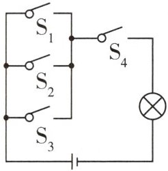 1 [2025杭州锦绣育才教育集团月考]如图,某同学学习物理“电流和电路”后设计了如图所示的电路图,其中$S_{1},S_{2},S_{3},S_{4}$分别表示四个可开闭的开关,“⊗”表示小灯泡,“||”表示电源.电源、小灯泡、开关和线路都能正常工作,当闭合开关$S_{1},S_{2},S_{3}$中任意一个,再闭合开关$S_{4}$时,小灯泡发光,按要求回答下列问题:
