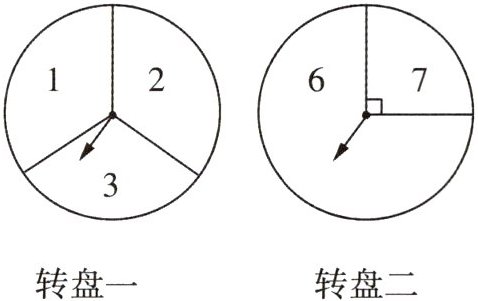 计算此类概率问题的关键是注意事件发生的可能性是否相等,转动转盘一共有三种情形,其中每种发生的可能性各占 $\frac{1}{3}$,而转盘二发生 6 和 7 的两种情形的可能性并不相等,容易画出错误的树状图如下: