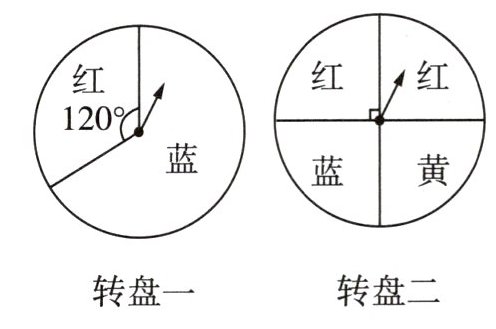 4 B 将转盘一标“蓝”的部分平均分成两部分,分别记为蓝₁、蓝₂,即转盘一平均分成三份,列表如下: