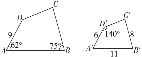 8 如图,四边形ABCD∽四边形A'B'C'D',且$\angle A= 62^{\circ}$,$\angle B= 75^{\circ}$,$\angle D'= 140^{\circ}$,AD= 9,A'B'= 11,A'D'= 6,B'C'= 8.
