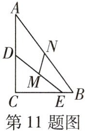 ∴CN = $\frac{1}{2}$AB = 5,CM = $\frac{1}{2}$DE = 2,当C,M,N在同一直线上时,MN取得最小值,(在△CMN中,MN > CN - CM,当C,M,N在同一直线上时,MN = CN - CM)MN的最小值为5 - 2 = 3。