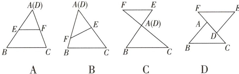 1 [2024宁德期中]下列图形中,$\triangle ABC\backsim\triangle DEF$,其中$\triangle ABC和\triangle DEF$不是位似图形的是(