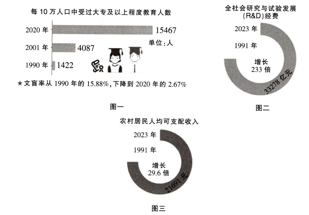 图一:我国人口受教育程度不断提高,文盲率大幅下降。说明我国教育事业蓬勃发展,教育普及程度大幅提升。图二:我国全社会研究与试验发展(R&D)经费投入不断增加。这表明我国日益重视科技研发,科技创新能力不断提升。图三:我国农村居民人均可支配收入显著提高,城乡差距持续缩小。反映出我国人民生活质量显著改善,朝着共同富裕的目标稳步前进。