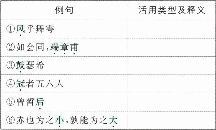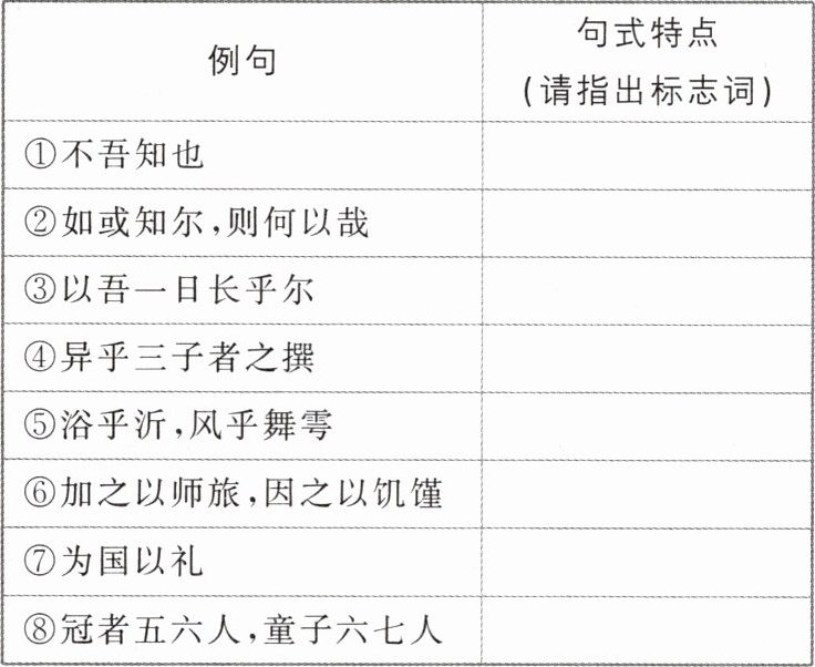 5.答案 ①宾语前置句 标志词:不(否定词)、吾(人称代词) ②宾语前置句 标志词:何(疑问代词)、以(动词) ③状语后置句 标志词:乎 ④状语后置句 标志词:乎 ⑤状语后置句 标志词:乎 ⑥状语后置句 标志词:以 ⑦状语后置句 标志词:以 ⑧定语后置句 无标志词(“五六人”“六七人”分别是“冠者”和“童子”的定语)