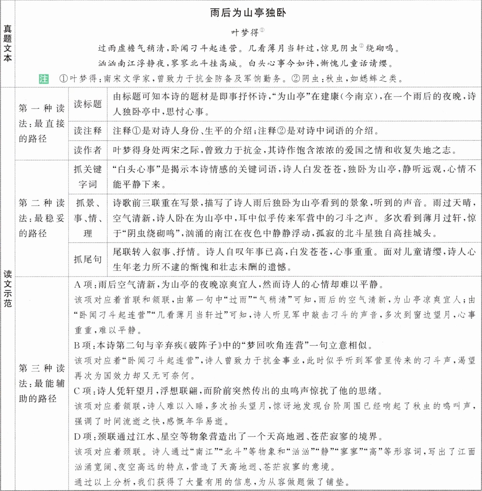 解析 C项,错误。诗人并没有“凭轩望月”,他只是因月色感受到了时光匆匆,虫声也不足以“惊扰”他,令他心惊的,是秋虫逼他正视自己的人生易老。