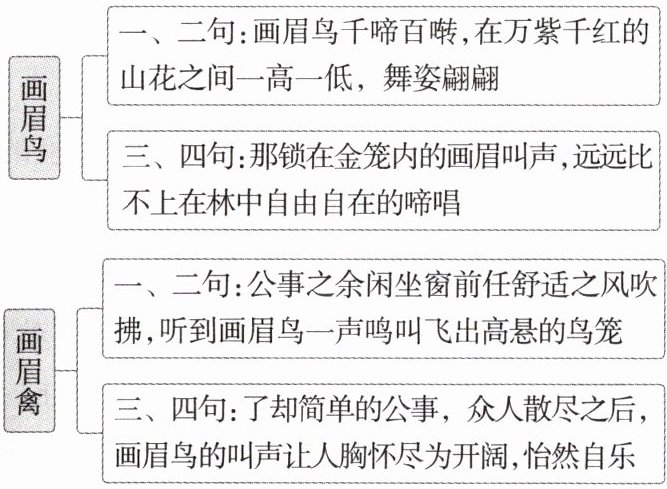 三、四句:那锁在金笼内的画眉叫声,远远比不上在林中自由自在的啼唱