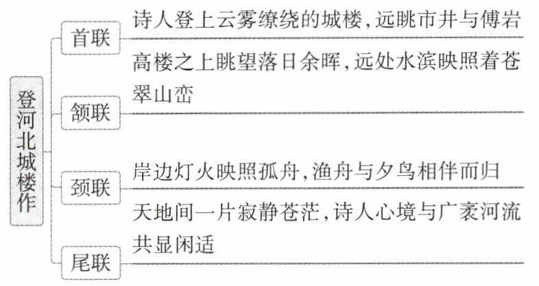 首联描述诗人登上城楼所看到的景色;颔联从大处着笔,显示出高、远、壮阔之感;颈联两句诗人将视角从辽阔的大背景中拉回,关注于眼前的小景与细景,展现了水面的遥远与寂静;尾联抒发了诗人内心自由快乐的情感,表现了诗人以山水为乐的情怀。