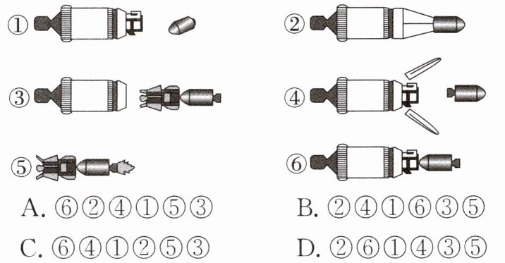其次,观察题目中的几幅图可知,②与材料一图示中第一级火箭、逃逸塔、第二级火箭分离后的状态相同,应当为船箭分离前的初始状态,故排在第一位。④中哥伦比亚号的方向与②一致,且前端呈现打开状态,据此可判断④为船箭分离初始状态后的第一步,即“火箭前端打开,哥伦比亚号弹出”,顺序应在②之后。①中哥伦比亚号方向发生变化却未完全转向,据此可判断①为哥伦比亚号转身的过程。⑥呈现“哥伦比亚”转向后与其他部分对接成功的状态,据此可判断⑥为“哥伦比亚”与“鹰”对接成功。③火箭部分与“哥伦比亚”“鹰”分离,据此可判断③为两艘小飞船对接后与火箭分离的过程。⑤两艘小飞船脱离火箭且右端有火苗,据此可判断⑤为两艘小飞船合体后脱离火箭,点火继续飞行的状态,由此可知,材料一中画横线语句图解的排序应为②④①⑥③⑤,所以排序恰当的一项是B项。
