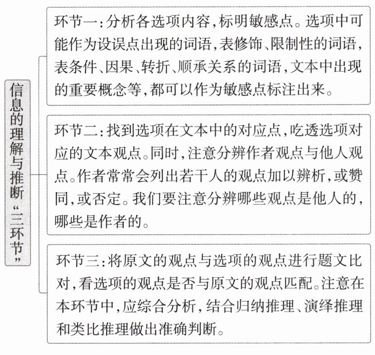 环节二:找到选项在文本中的对应点,吃透选项对应的文本观点。同时,注意分辨作者观点与他人观点。作者常常会列出若干人的观点加以辨析,或赞同,或否定。我们要注意分辨哪些观点是他人的,哪些是作者的。