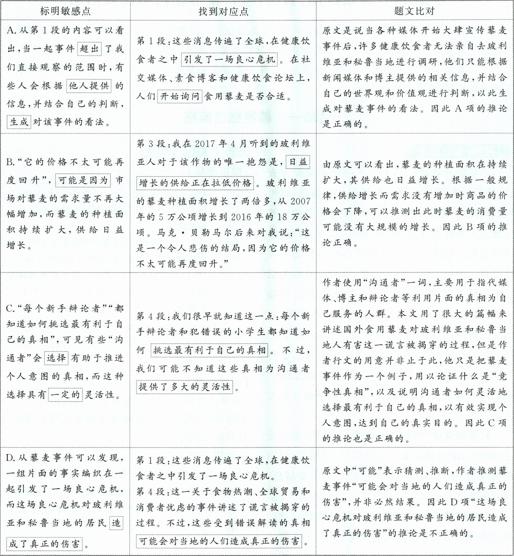 环节一:分析各选项内容,标明敏感点。选项中可能作为设误点出现的词语,表修饰、限制性的词语,表条件、因果、转折、顺承关系的词语,文本中出现的重要概念等,都可以作为敏感点标注出来。