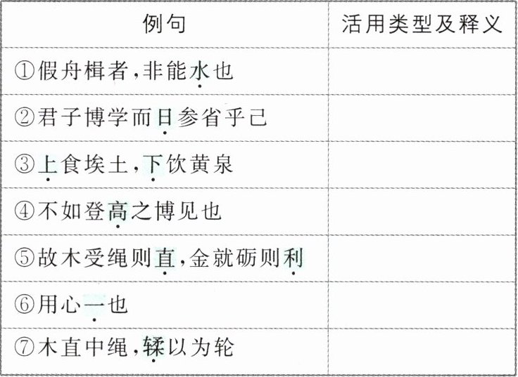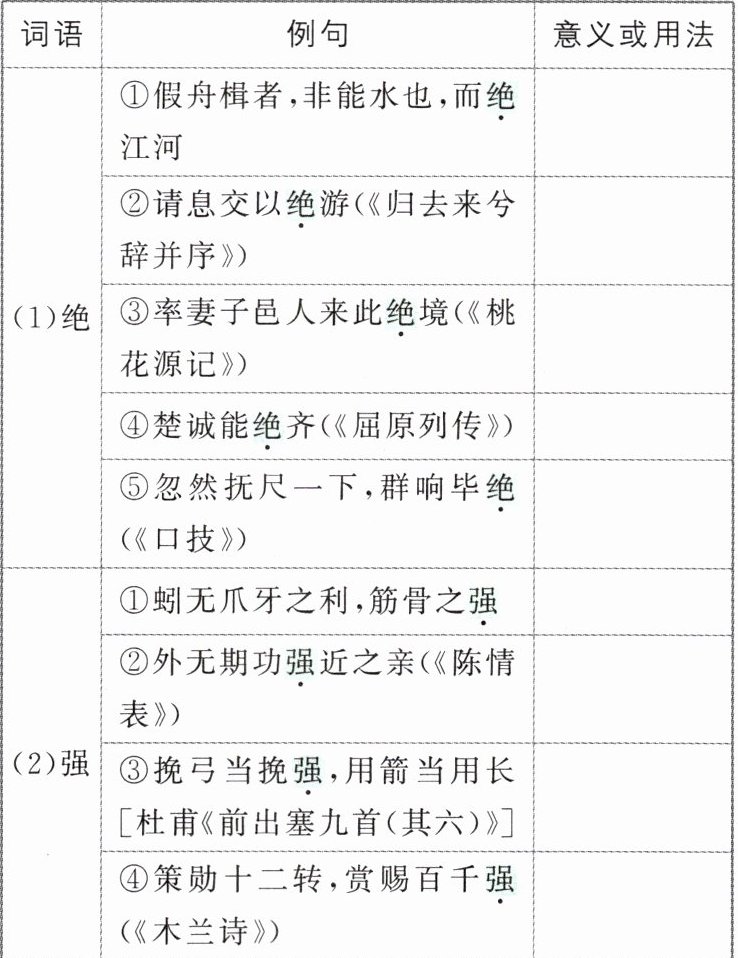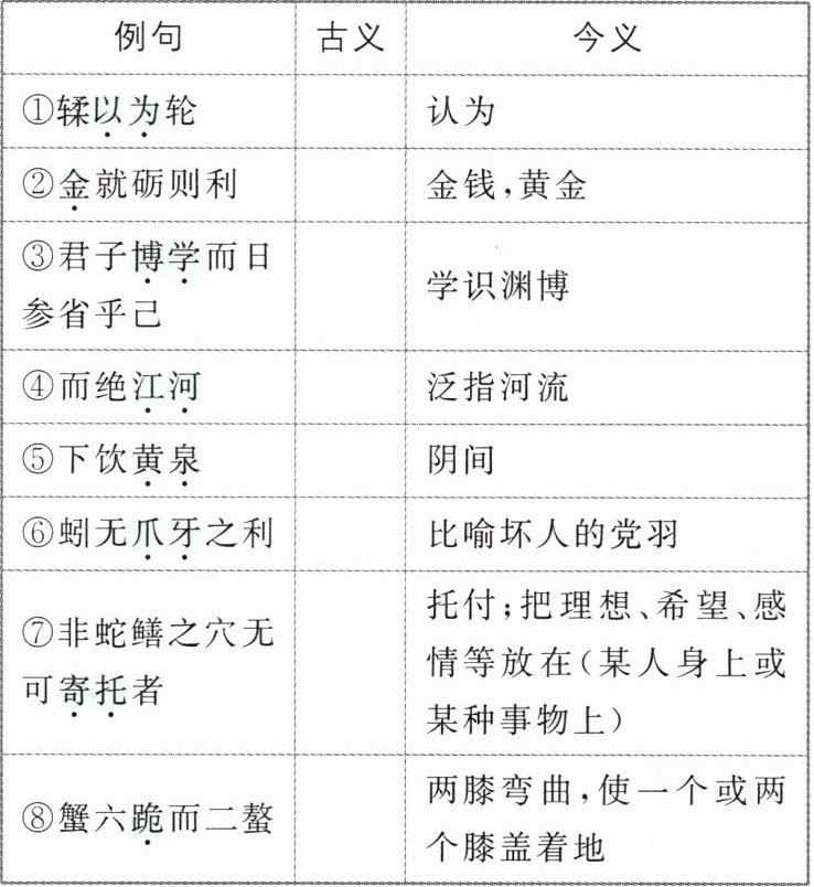 2.答案①把……做成 ②金属制的刀斧等 ③广泛地学习 ④特指长江与黄河 ⑤地下的泉水 ⑥爪子和牙齿 ⑦寄身 ⑧蟹腿