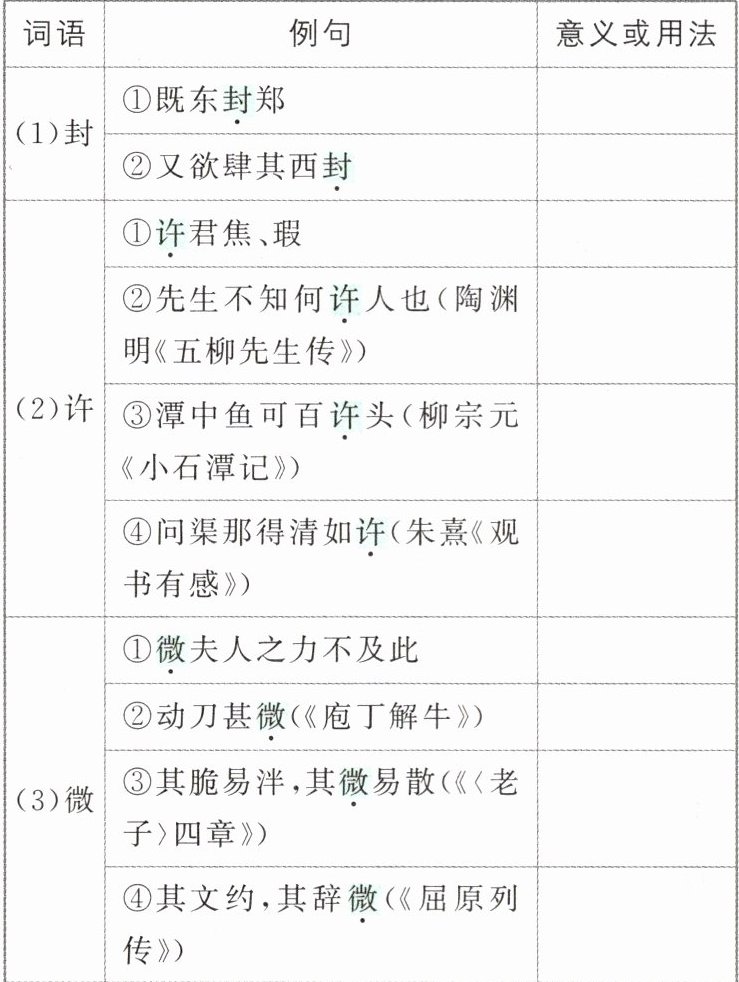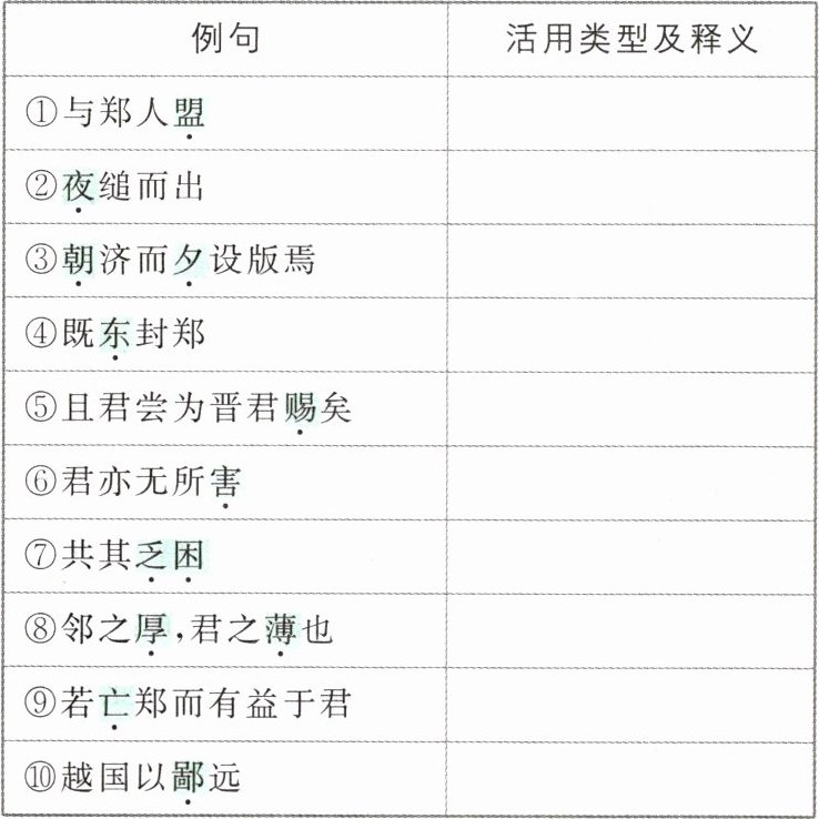 4.答案 ①名词作动词,订立盟约 ②名词作状语,在夜里 ③名词作状语,在早上/在晚上 ④名词作状语,在东边 ⑤动词作名词,恩惠 ⑥动词作名词,害处 ⑦形容词作名词,缺少的资粮 ⑧形容词作动词,变雄厚/变薄弱 ⑨使动用法,使……灭亡 ⑩意动用法,把……当作边邑
