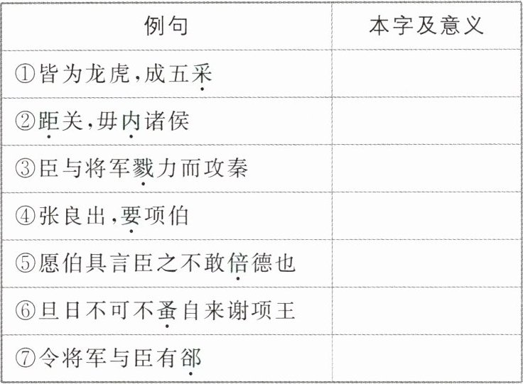 1.答案 ①同“彩”,色彩 ②同“拒”,据守/同“邀”,接纳 ③同“勠”,并,合 ④同“邀”,邀请 ⑤同“背”,背弃 ⑥同“早”,比一定的时间靠前 ⑦同“隙”,隔阂、嫌怨