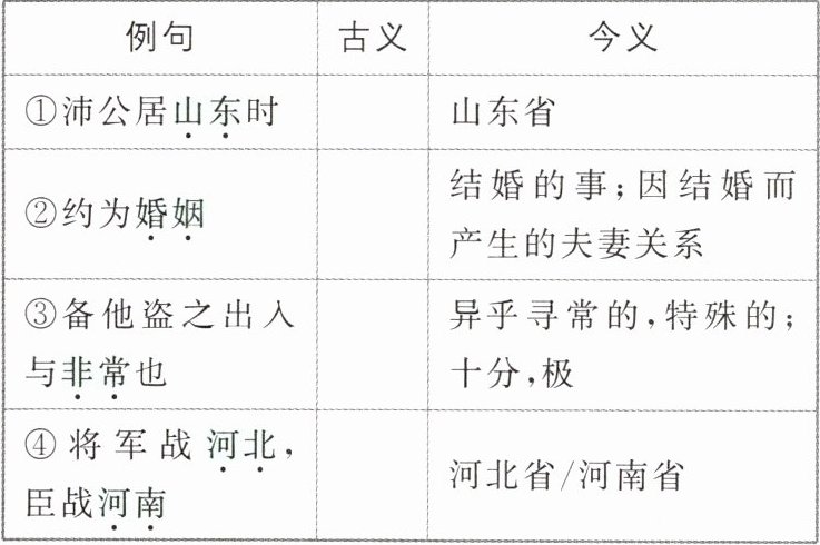 2.答案 ①崤山以东,泛指东方六国之地 ②亲家,有婚姻关系的亲戚 ③意外的变故 ④黄河以北/黄河以南