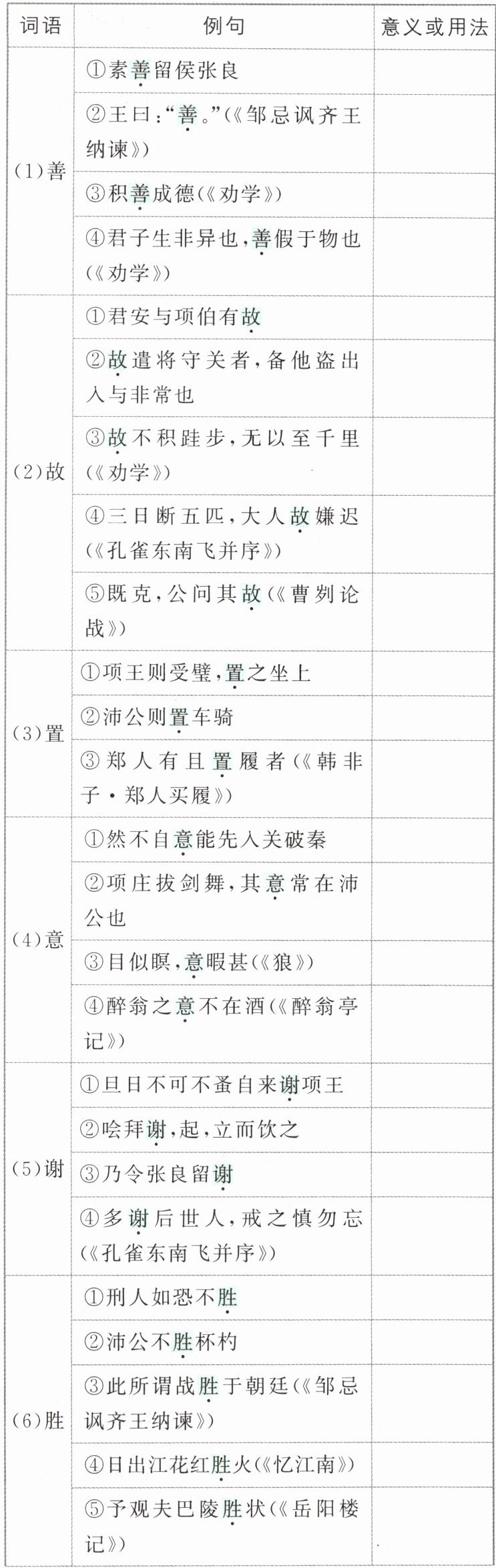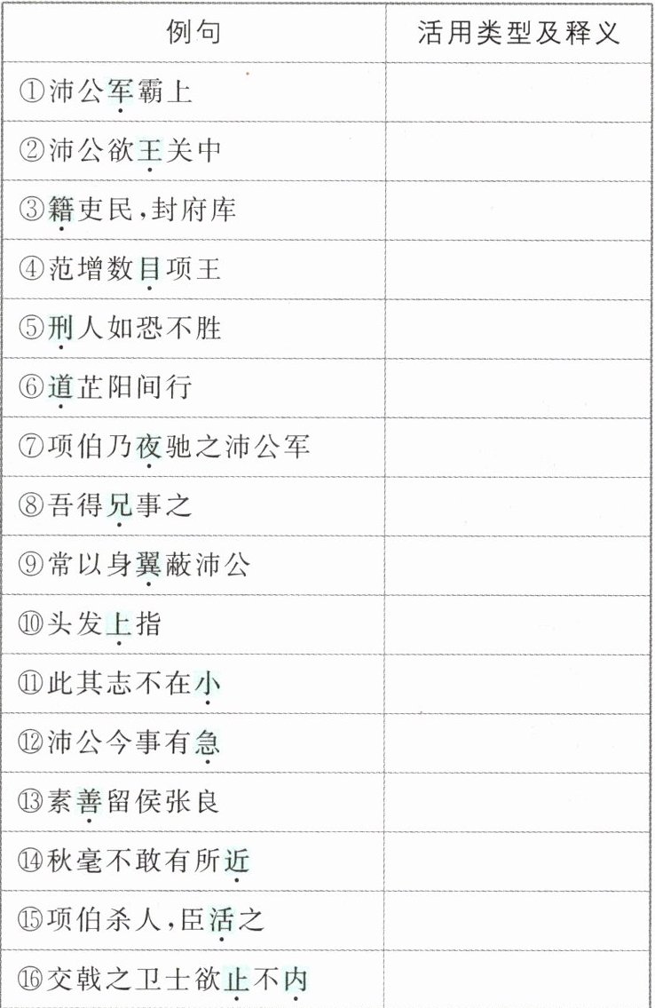 4.答案 ①名词作动词,驻军 ②名词作动词,称王 ③名词作动词,造册登记 ④名词作动词,递眼色 ⑤名词作动词,用刑 ⑥名词作动词,取道 ⑦名词作状语,在夜里 ⑧名词作状语,像对待兄长一样 ⑨名词作状语,像翅膀一样 ⑩名词作状语,向上 ⑪形容词作名词,小的方面 ⑫形容词作名词,危急的事 ⑬形容词作动词,交好、友善 ⑭形容词作动词,据为己有 ⑮使动用法,使……活命 ⑯使动用法,使……止步/使动用法,使……进入