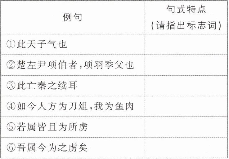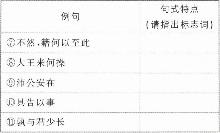 5.答案 ①判断句 标志词:也 ②判断句 标志词:……者……也 ③判断句 标志词:耳 ④判断句 标志词:为 ⑤被动句 标志词:为所 ⑥被动句 标志词:孰与(与……相比,谁更……) ⑦宾语前置句 标志词:何(疑问代词)、以(介词) ⑧宾语前置句 标志词:何(疑问代词)、操(动词) ⑨宾语前置句 标志词:安(疑问代词)、在(介词) ⑩状语后置句 标志词:以 ⑪固定句式 标志词:孰与(与……相比,谁更……)