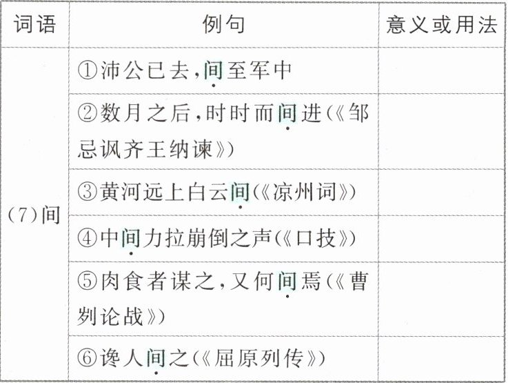 (7)①副词,秘密地 ②副词,间或、偶然 ③名词,中间 ④动词,夹杂 ⑤动词,参与 ⑥动词,离间