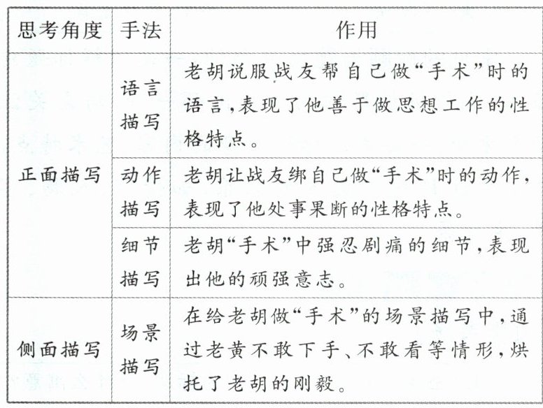 1. 审题干,明方向:“以老胡形象为例”,明确了分析的对象及角度;“谈谈小说塑造人物形象时运用了哪些表现手法”,可联系正面描写(外貌、语言、神态、动作、心理及细节描写)、侧面烘托等手法。