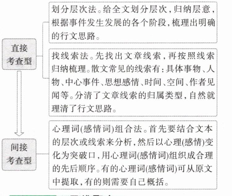 散文的行文思路可直接考查,也可间接考查。解答此类题目,可以参考以下的技法: