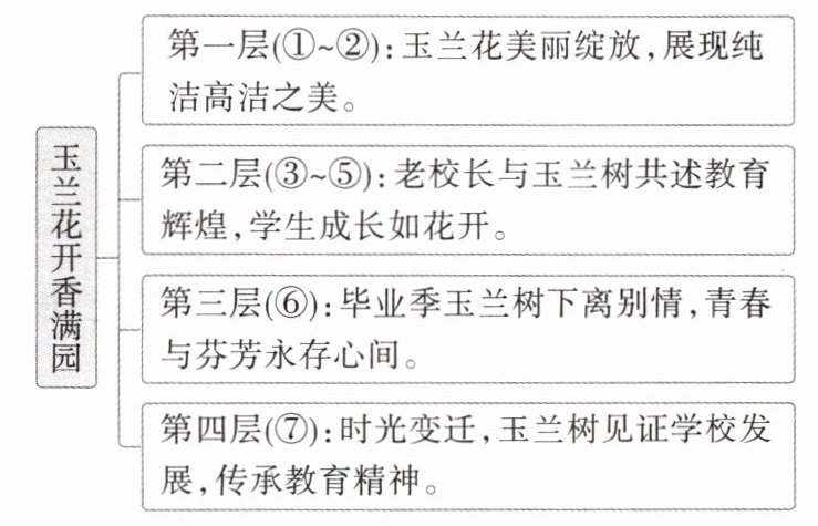 ⑤难以忘怀我生命中那一张张朝气蓬勃、灿若玉兰的脸:成绩蝉联年级桂冠的森、文采飞扬知书达理的曼、叱咤球场所向无敌的鹏、沉稳善良勤勤恳恳的明、寡言少语埋头苦学的宁……曾几何时,我伴着他们吟咏佳词丽句,书写锦绣文章,品味千古诗情;曾几何时,他们登顶高等学府,成为行业翘楚,开启精彩人生,正像这一树树玉兰,绽放枝头,香溢四海!
