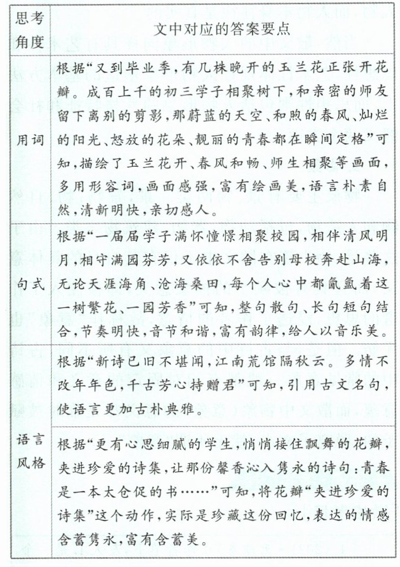 例2【答案】 ①描绘了玉兰花开、春风和畅、师生相聚等画面,多用形容词,画面感强,富有绘画美,语言朴素自然,清新明快,亲切感人。②整句散句、长句短句结合,节奏明快,音节和谐,富有韵律,给人以音乐美。③引用古文名句,使语言更加古朴典雅。④将花瓣“夹进珍爱的诗集”这个动作,实际是珍藏这份回忆,表达的情感含蓄隽永,富有含蓄美。