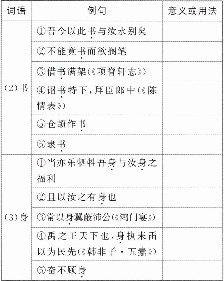 (3)①代词,均译为“自身” ②名词,身孕 ③名词,身体 ④副词,亲自 ⑤名词,生命