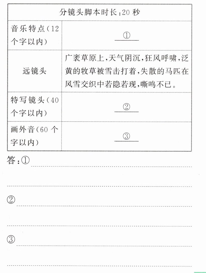 16. 文本描写了伊斯哈格遭遇暴风雪的场景,其中黑马在暴风雪中不离不弃、保护伊斯哈格的场面,真切感人。学校“光影翰墨”社团想把这场面拍成短视频,由你负责拟写视频拍摄脚本。根据文本,完成以下表格。
