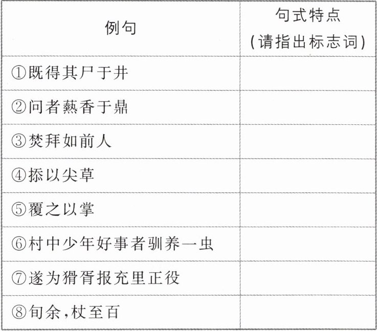 5.答案 ①状语后置句 标志词:于 ②状语后置句 标志词:于 ③状语后置句 标志词:如 ④状语后置句 标志词:以 ⑤状语后置句 标志词:以 ⑥定语后置句 标志词:者 ⑦被动句 标志词:为 ⑧被动句 无标志词(“杖”意为“被用杖打”)