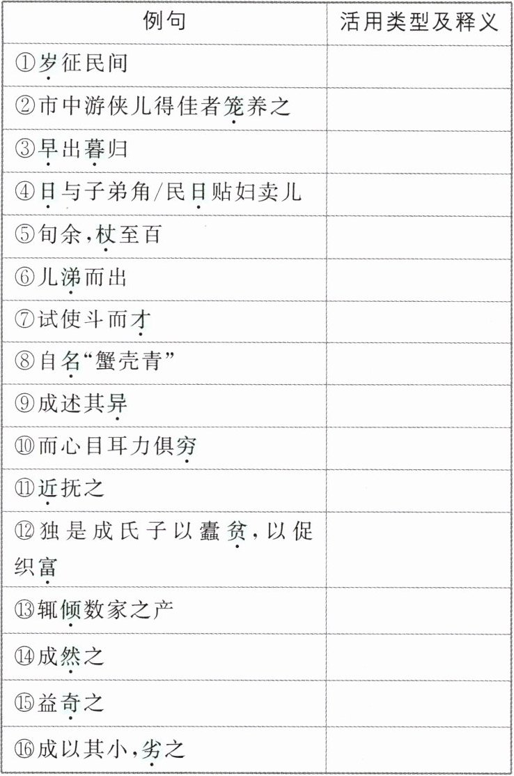 4.答案 ①名词作状语,每年 ②名词作状语,用笼子 ③名词作状语,在早上/在晚上 ④名词作状语,每天 ⑤名词作动词,被用杖打 ⑥名词作动词,流着泪 ⑦名词作动词,有才能。这里指勇猛善斗 ⑧名词作动词,命名 ⑨形容词作名词,非凡本领 ⑩形容词作动词,用尽 ⑪形容词作动词,走近 ⑫形容词作动词,变穷/变富 ⑬使动用法,使……倾尽 ⑭意动用法,认为……正确 ⑮意动用法,认为……奇特 ⑯意动用法,认为……低劣