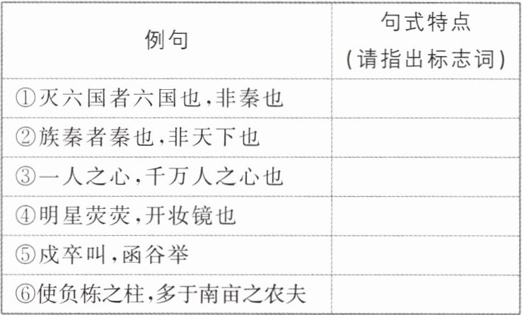 4. 答案 ①判断句 标志词:……者……也、非 ②判断句 标志词:……者……也、非 ③判断句 标志词:也 ④判断句 标志词:也 ⑤被动句 无标志词(“举”意为“被攻占”) ⑥状语后置句 标志词:于