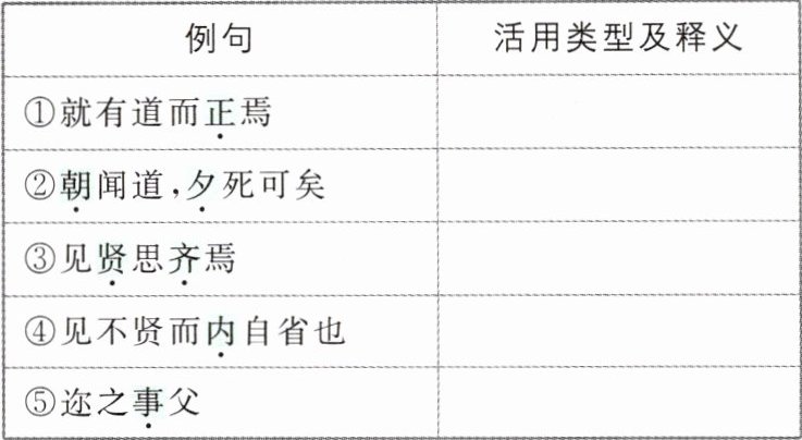 4 答案 ①形容词作动词,匡正 ②名词作状语,在早晨/在晚上 ③形容词作名词,德才兼备的人/形容词作动词,与……看齐 ④名词作状语,在心里 ⑤名词作动词,侍奉