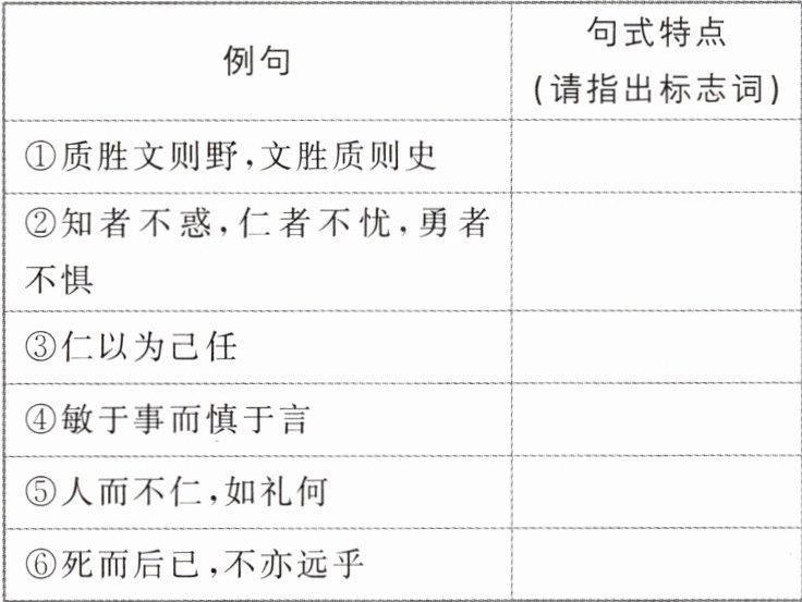 5 答案 ①判断句 标志词:则 ②判断句无标志词 ③宾语前置句 标志词:仁(宾语)、以(介词) ④状语后置句 标志词:于 ⑤固定句式 标志词:如……何 ⑥表反问的固定句式 标志词:不亦……乎
