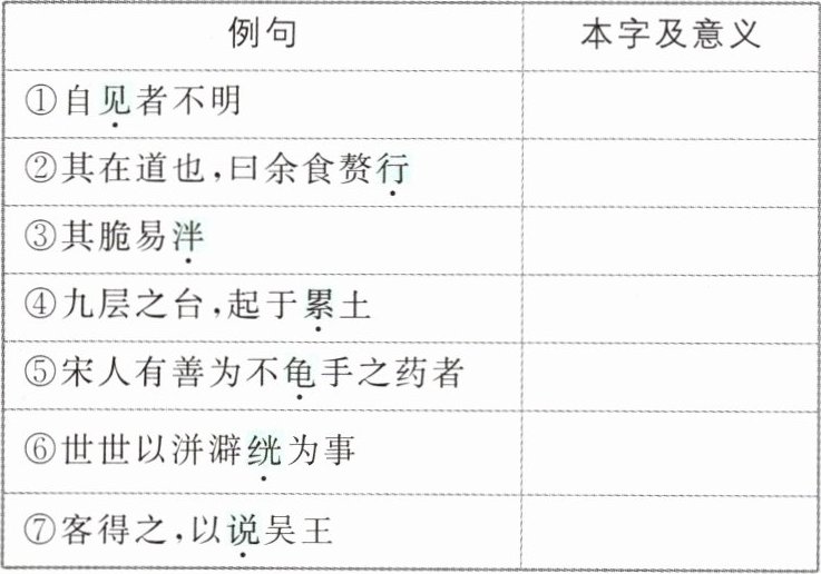 种,我树③(______)之成而实五石④(______)。以盛水浆,其坚⑤(______)不能自举也。剖之以为瓢,则瓠落⑥(______)无所容。非不呺然⑦(______)大也,吾为其无用而掊⑧(______)之。”庄子曰:“夫子固拙于用大矣。宋人有善为不龟⑨(______)手之药者,世世以洴澼⑩(______)絖⑪(______)为事⑫(______)。客闻之,请买其方百金。聚族而谋之曰:‘我世世为洴澼絖,不过数金。今一朝而鬻⑬(______)技百金,请与之。’客得之,以说⑭(______)吴王。越有难,吴王使之将⑮(______)。冬,与越人水战,大败越人,裂地⑯(______)而封之。能不龟手一⑰(______)也,或⑱(______)以封,或不免于洴澼絖,则所用之异也。今子有五石之瓠,何不虑⑲(______)以为大樽而浮乎江湖,而忧其瓠落无所容?则夫子犹有蓬之心⑳(______)也夫!”