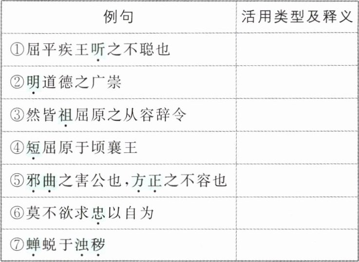 4 答案 ①动词作名词,听觉、听力 ②形容词作动词,阐明 ③名词作动词,效法,继承 ④形容词作动词,诋毁 ⑤形容词作名词,品行不正的小人/端方正直的人 ⑥形容词作名词,忠臣 ⑦名词作状语,像蝉那样/形容词作名词,污秽的境地