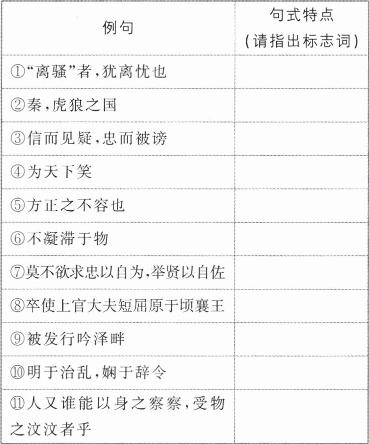 5 答案 ①判断句 标志词:……者,……也 ②判断句 无标志词 ③被动句 标志词:见、被 ④被动句 标志词:为……所容 ⑤被动句 无标志词(“容”译为“为……所容”) ⑥被动句 标志词:于 ⑦宾语前置句 标志词:自(两个,均为代词)、为(动词)、佐(动词) ⑧状语后置句 标志词:于 ⑨状语后置句 无标志词 ⑩状语后置句 标志词:之