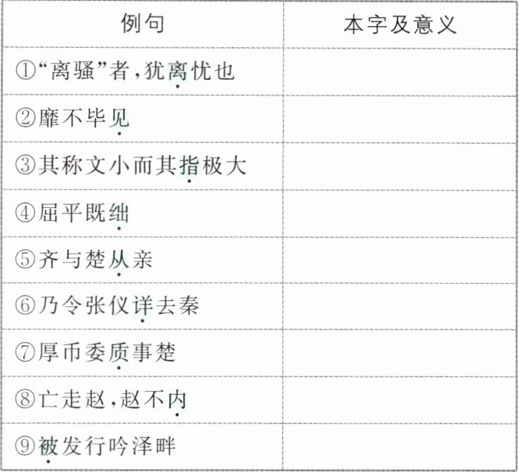 1 答案 ①同“罹”,遭受 ②同“现”,显现 ③同“旨”,意旨 ④同“黜”,指被罢免官职 ⑤同“纵”,合纵,联合抗秦 ⑥同“佯”,假装 ⑦同“贽”,见面礼 ⑧同“纳”,接纳 ⑨同“披”,披散